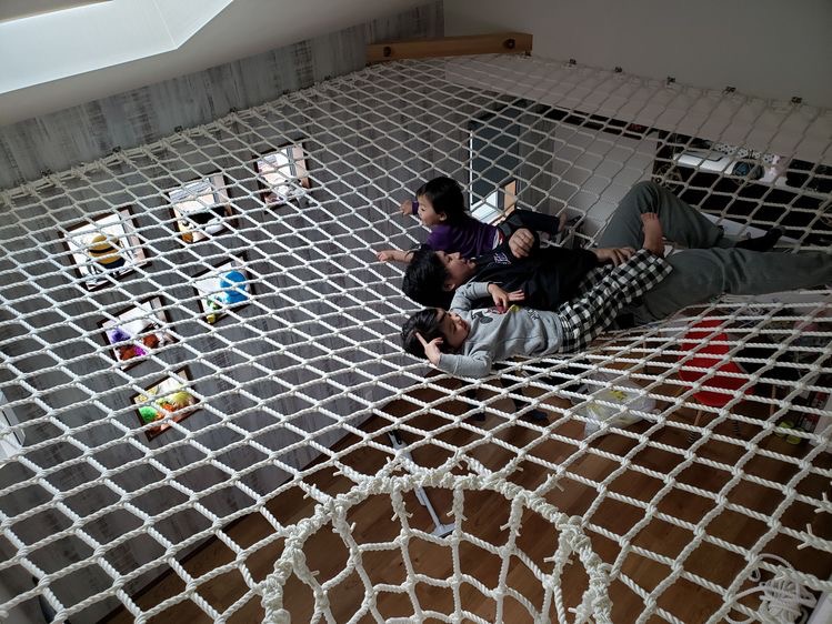ちなみに、夫は「アスレチックハウス」にするつもりはないらしく、やるなら天井から手すりまで縦にネットを張ることで解決したいようです。