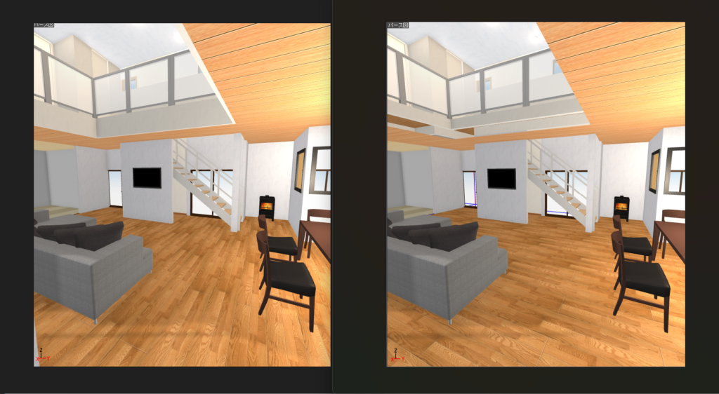 まず、玄関ホールからリビングに入ったとき(左:短手貼り 右:長手貼り)