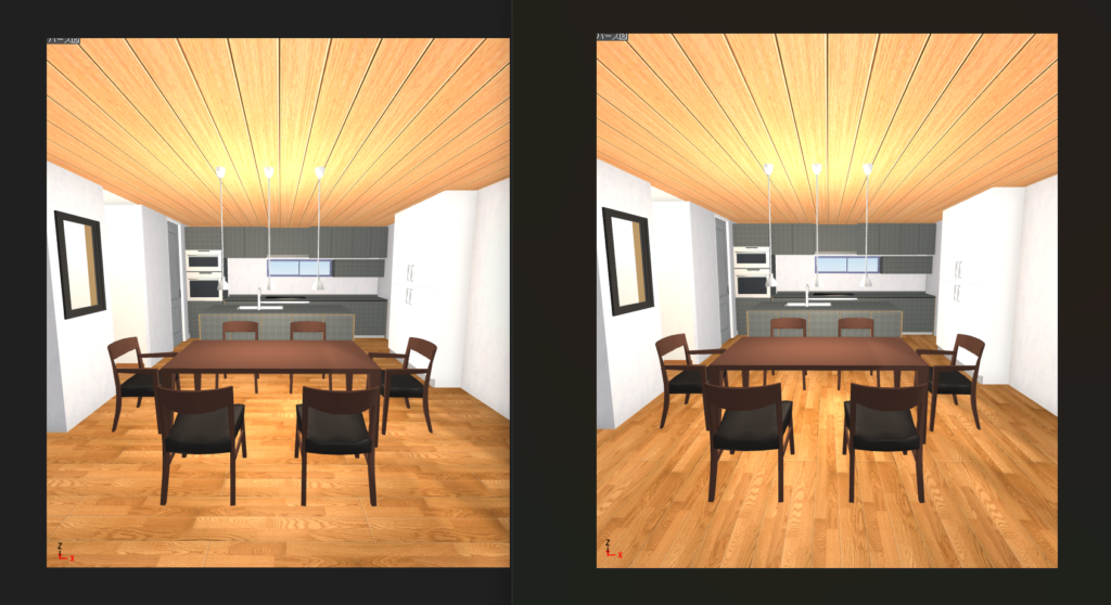 次にリビングからキッチンを見たとき(左:短手貼り 右:長手貼り)