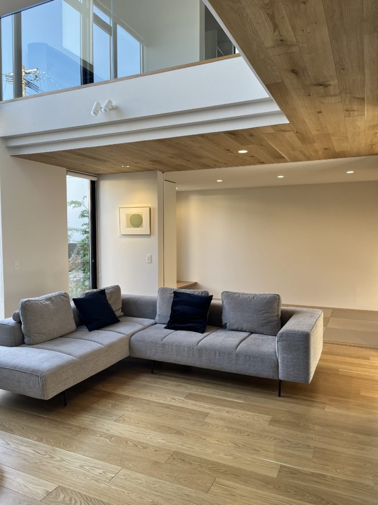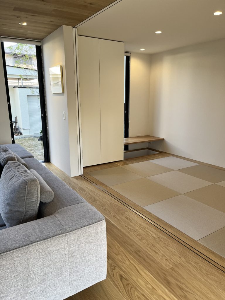 段差などは設けず、むしろ中央に畳、その周辺をリビングのフロアと同じ板材で繋げることで、一体感を持たせています。