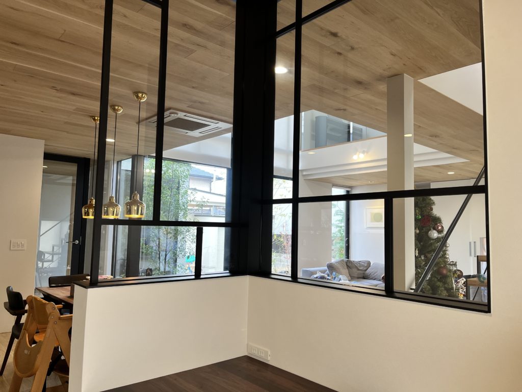 吹き抜けの大窓と同じデザインの室内窓で緩やかに仕切られています。