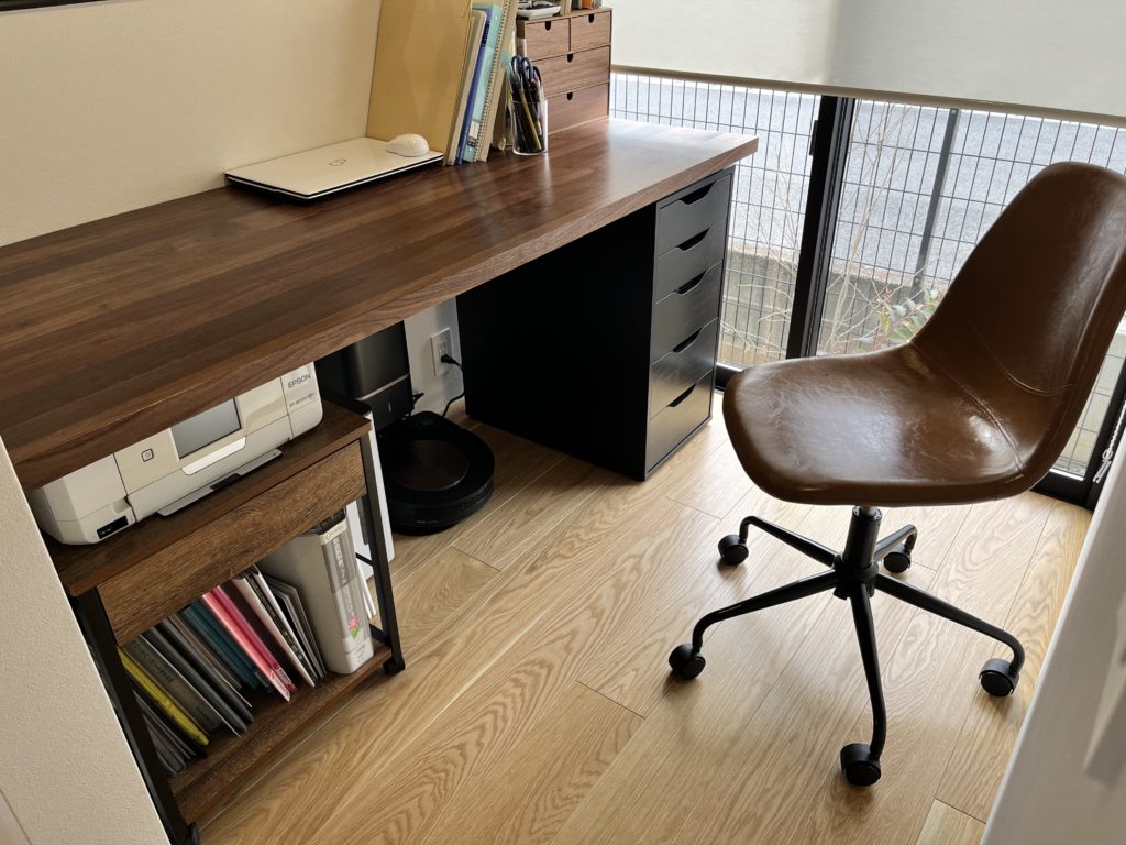 テーブルのみ造作で、右側の収納はIKEAのものを置きました。左側にはプリンターを乗せたキャスター付きワゴン。そしてルンバ基地も。