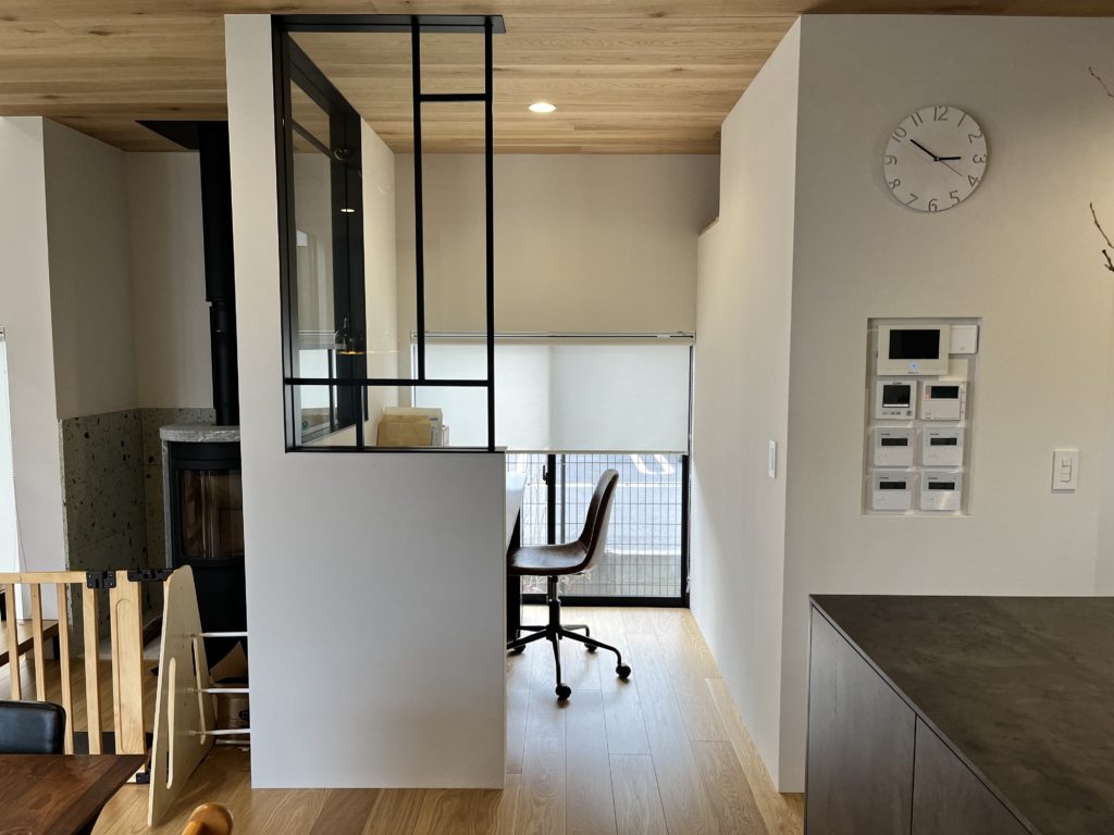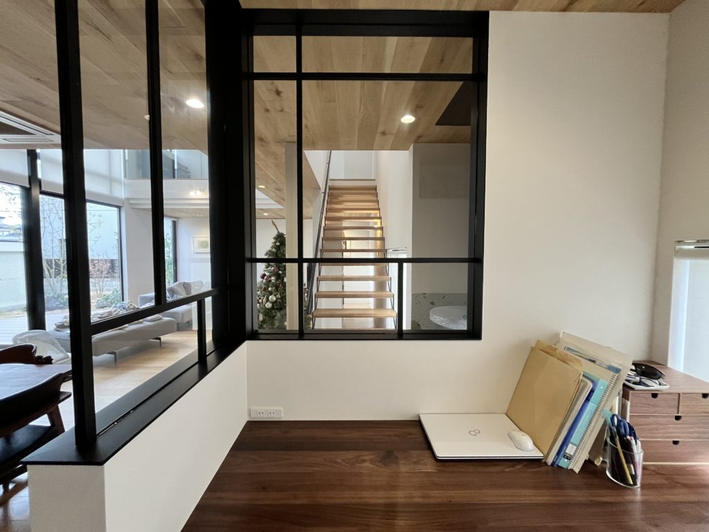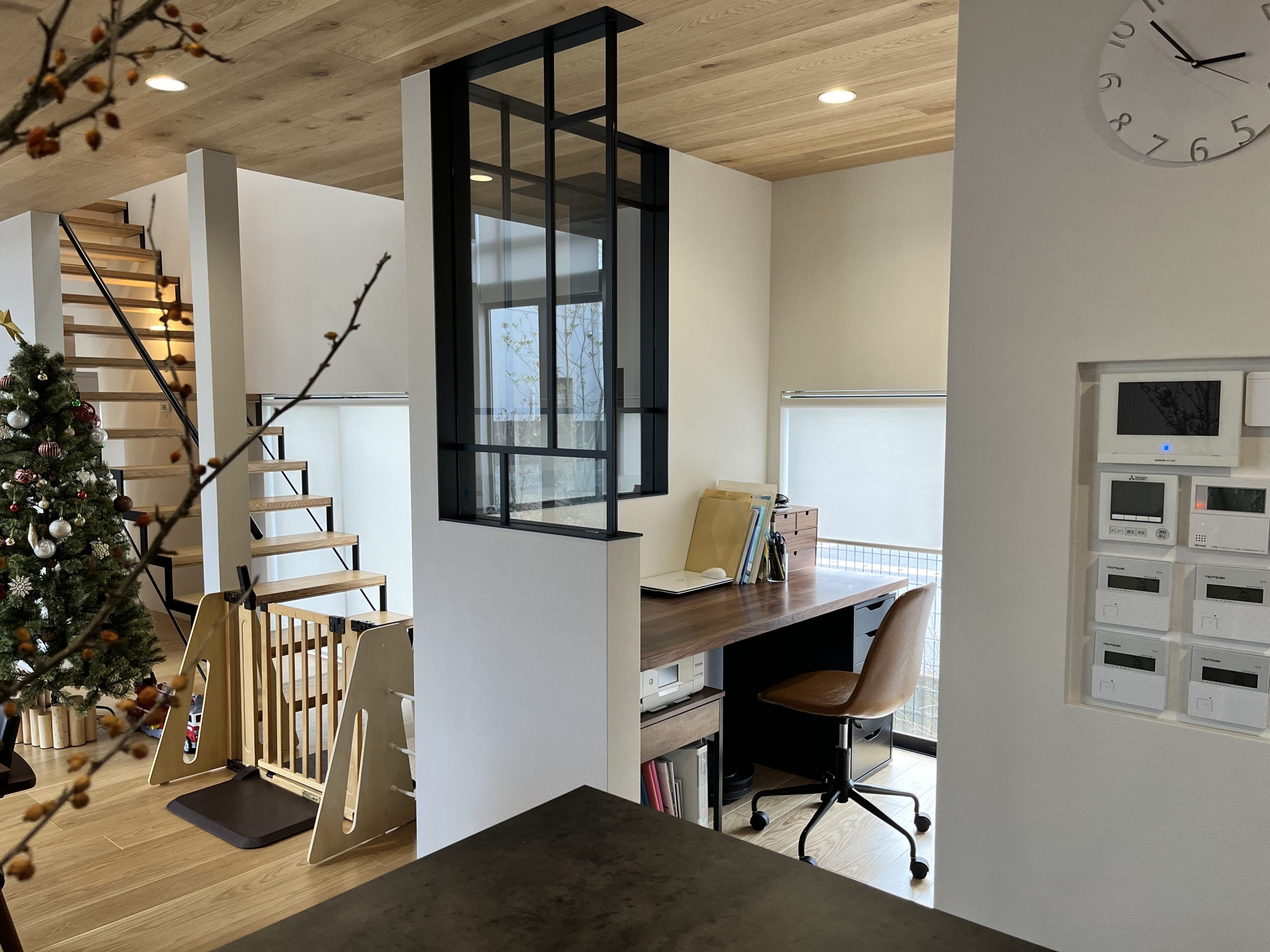 しかし、パソコンやプリンター、郵便物や文房具などでごちゃつくので、完全に仕切らなくていいが覗き込まないと見えない、というような空間にしてほしいと要望し、このような形になりました。