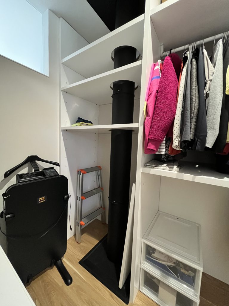 この筒は薪ストーブの煙突です。ファミリークロークを貫いています。